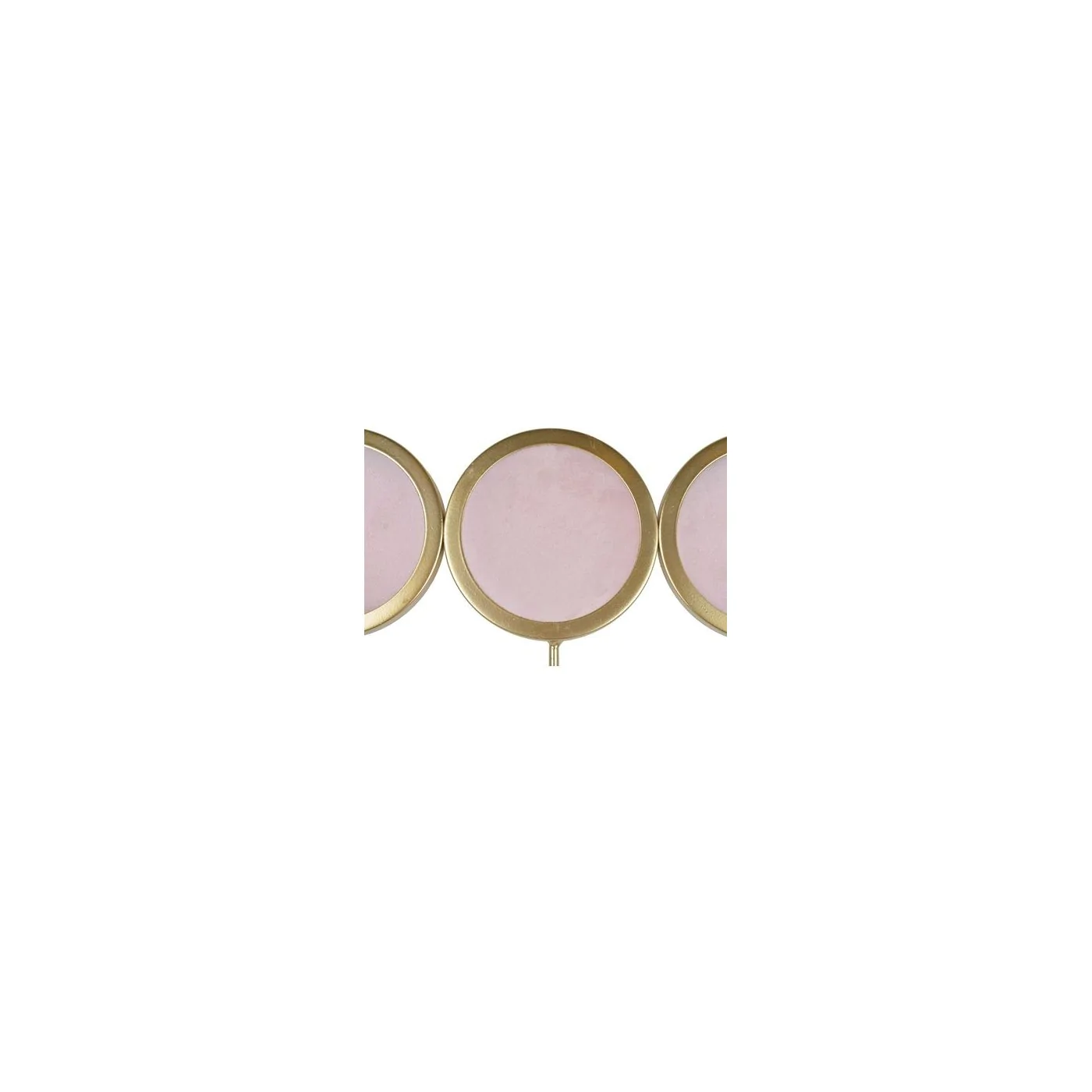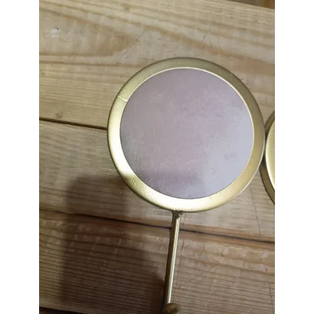 Obręcz wieszaka dookoła weluru i haczyk w kolorze złotym w półpołysku jest to odcień jasnego złotego, środek z weluru w kolorze pudrowego różu, z tyłu plecki z płyty wiórowej.