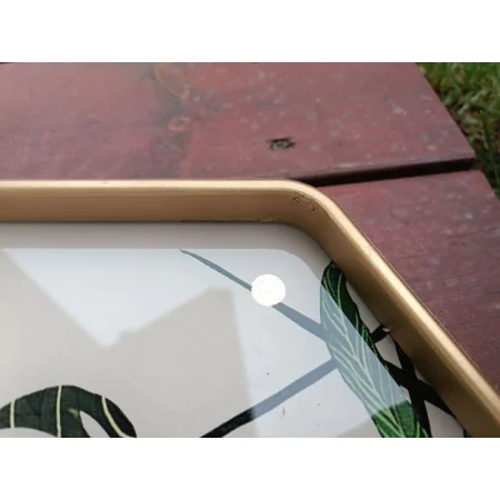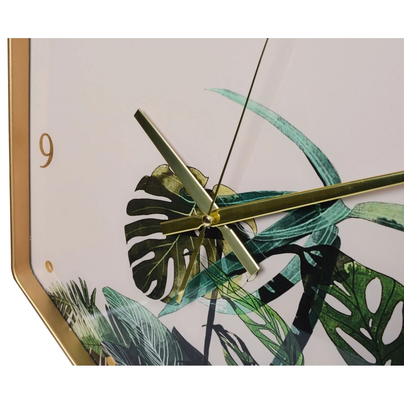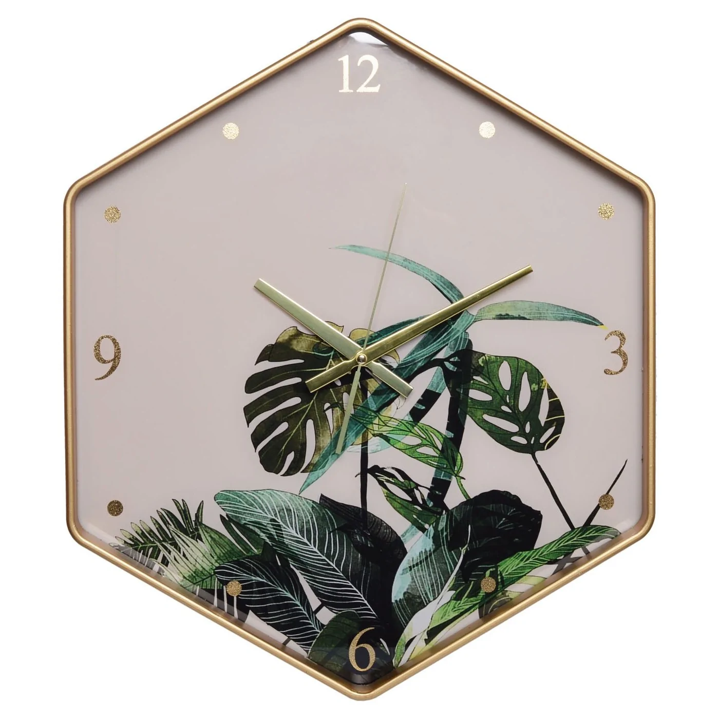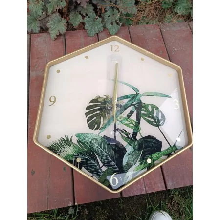 Zegar ścienny w kształcie sześciokąta z motywem liści monster. Zegar wykonana z twardego tworzywa. Obramowanie w kolorze złotym. Tarcza z motywem liści, wskazówki i cyfry w kolorze złotym. Mechanizm zegara działa na baterię. Piękny zegar do każdego pomieszczenia w domu.