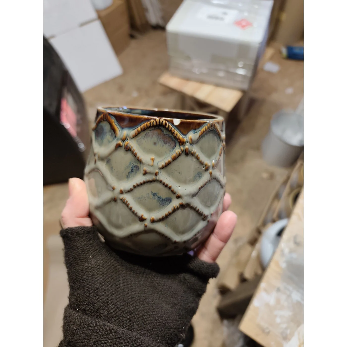 Osłonka doniczka ceramiczna w kolorze niebieskim i brązowym o wymiarach ok 11x11,5 cm .