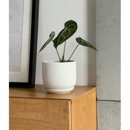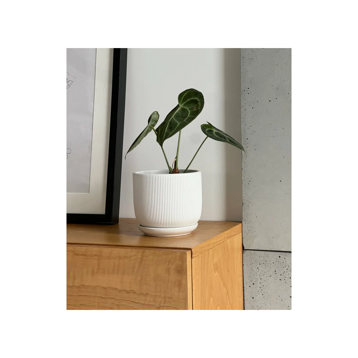 Duża Doniczka biała z podstawkiem o średnicy 17 cm w kolorze bieli z ryflowaną fakturą ceramiki.