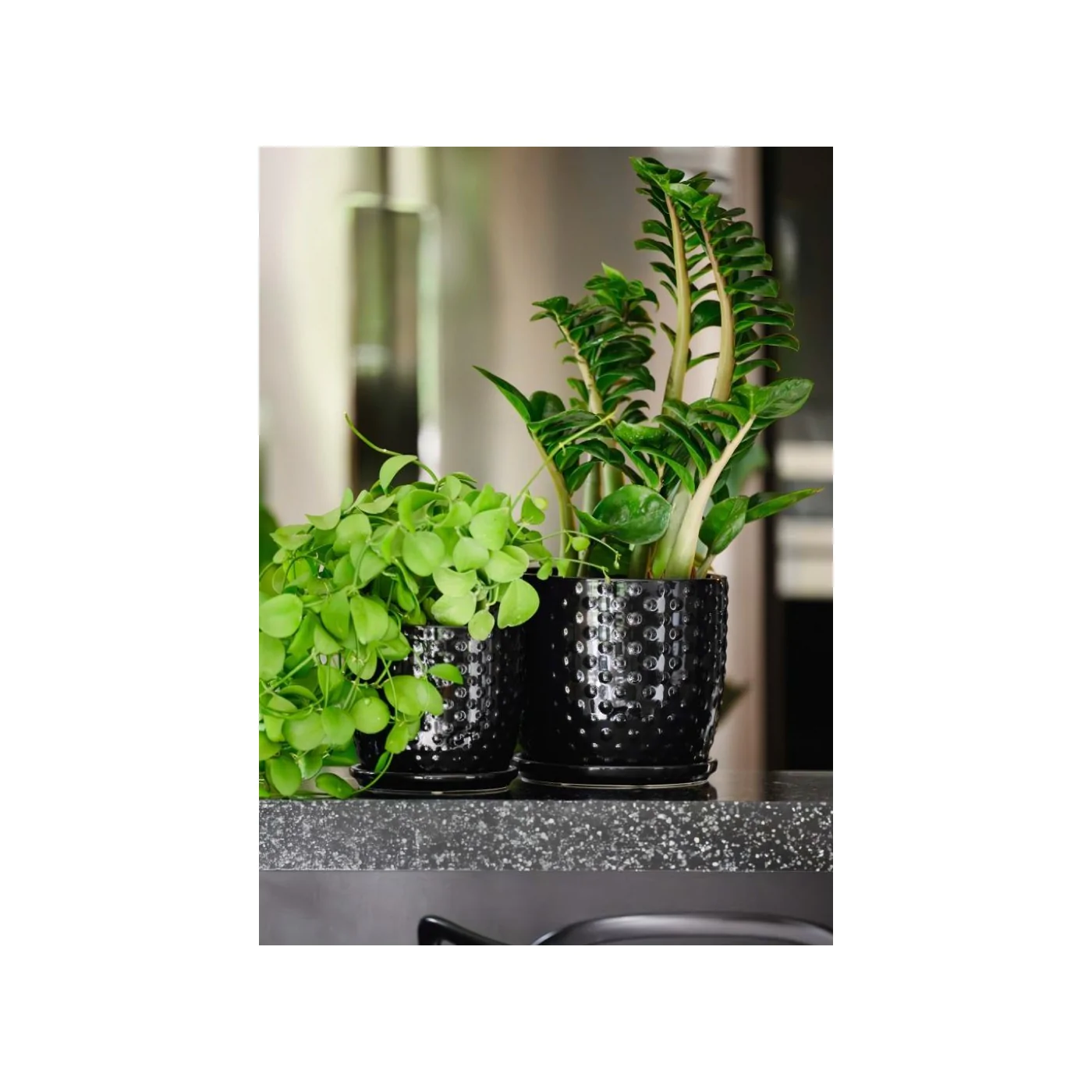 Wpasuje się w kolorystykę CZARNYCH dodatków w domu. Również wzbogaci styl dekoracyjny z dodatkami w kolorach zieleni. Będzie ciekawym akcentem kontrastowym dla zielonej rośliny.