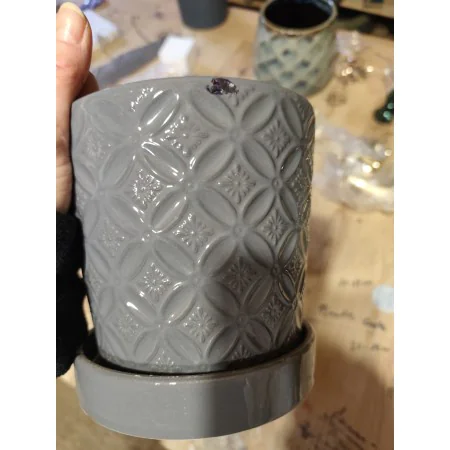 Doniczka szara z podstawkiem 15x15 cm w kolorze szarości z ozdobnym wzorem.