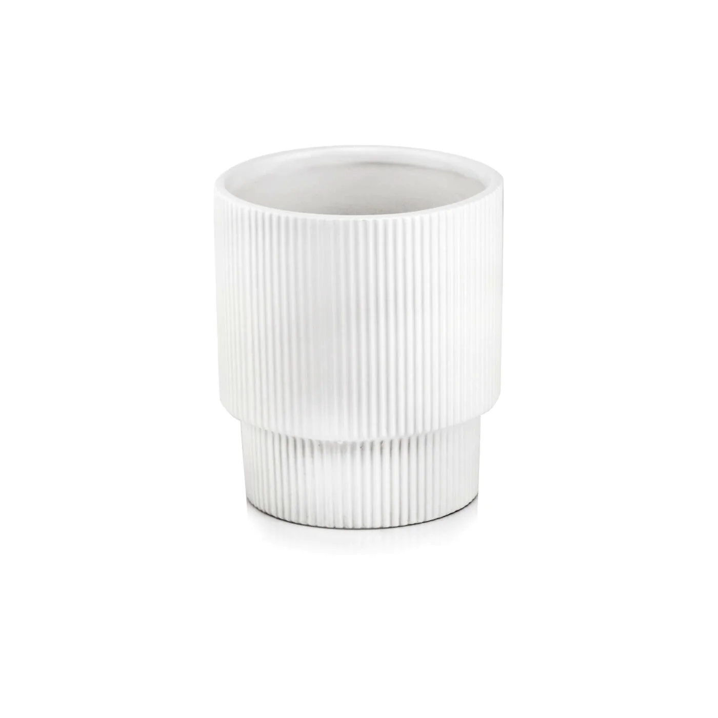 Osłonka doniczka okrągła biała matowa 13 cm o fakturze karbowanej.