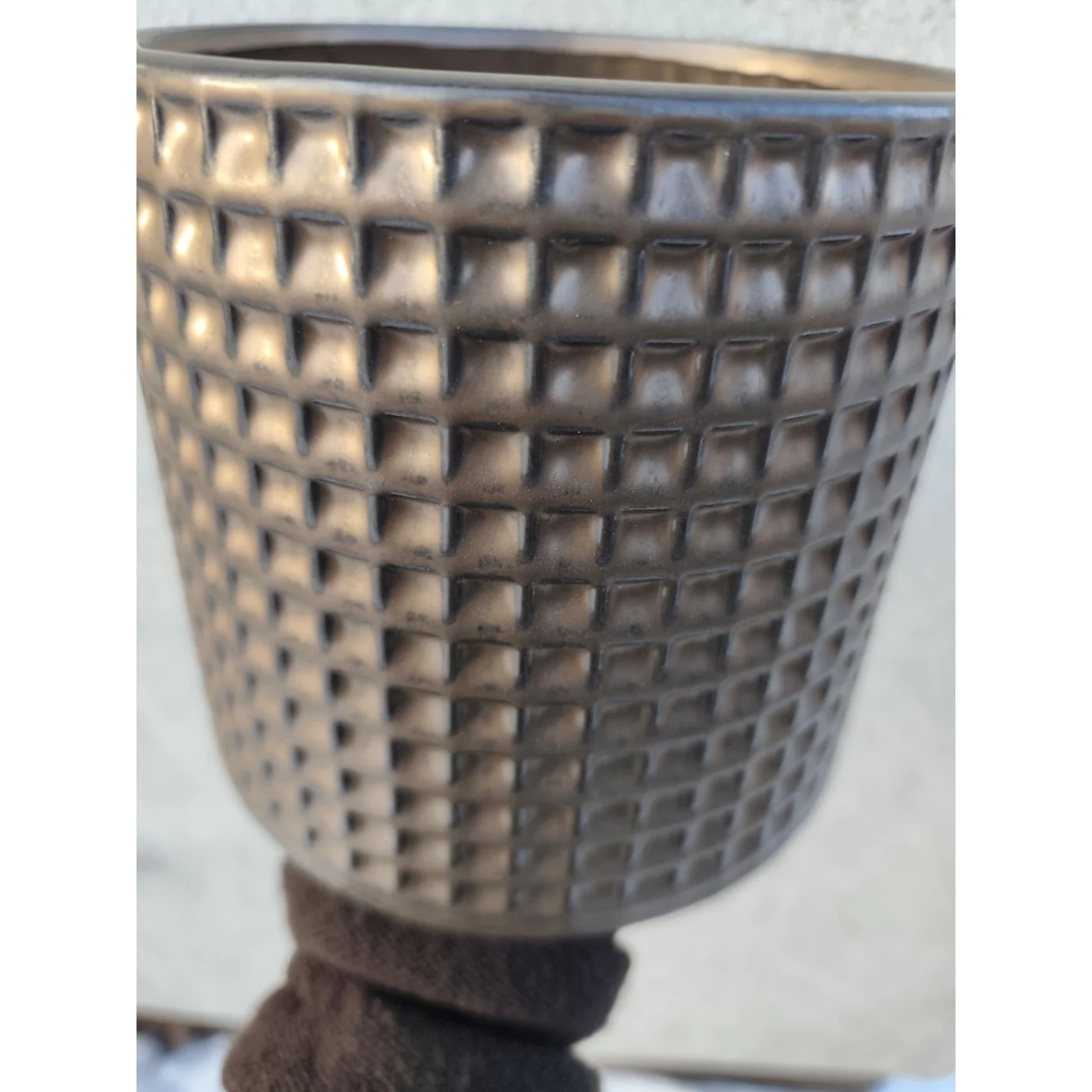 Idealna osłonka do malego kwiatka - piękna osłonka w stylu VINTAGE. Okrągła osłonka wykonana jest z ceramiki z fakturą kratkowaną.