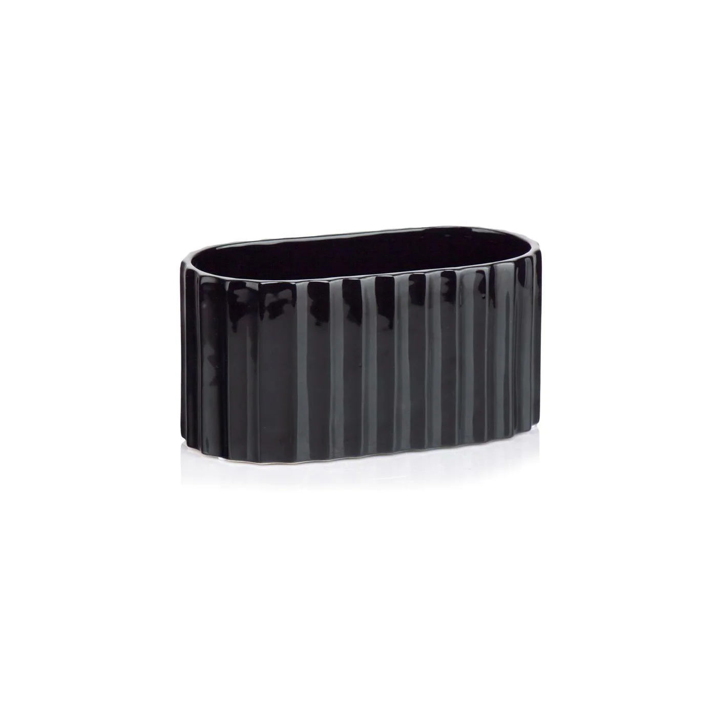 Czarna osłonka w kształcie owalnym, ceramiczna rynienka, osłonka karbowana, o długości 25 x 14 cm , wysokości 12,7 cm