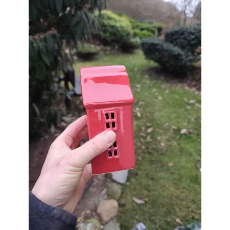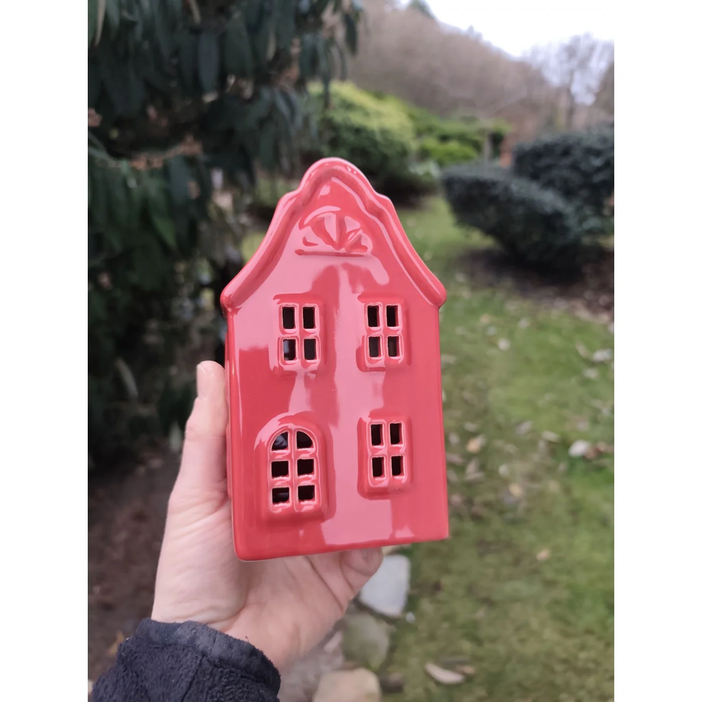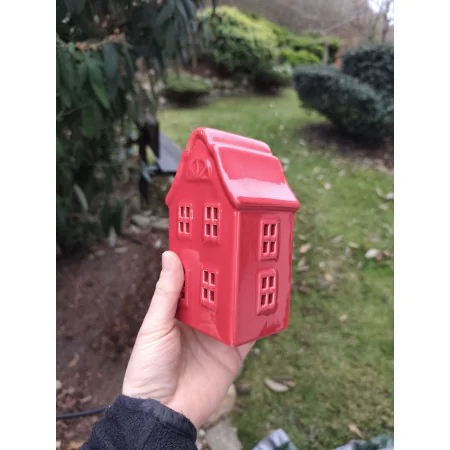 Domek wykonany z ceramiki w połysku w kolorze czerwieni.