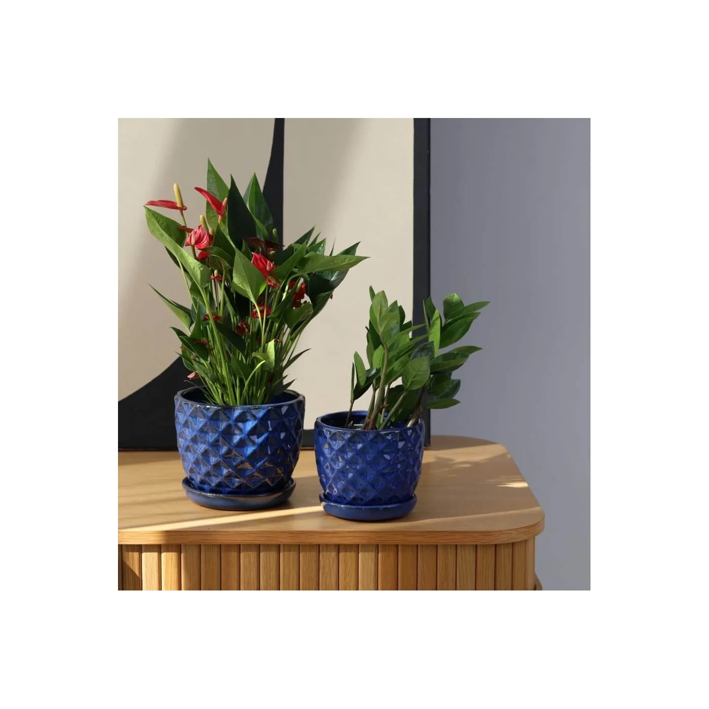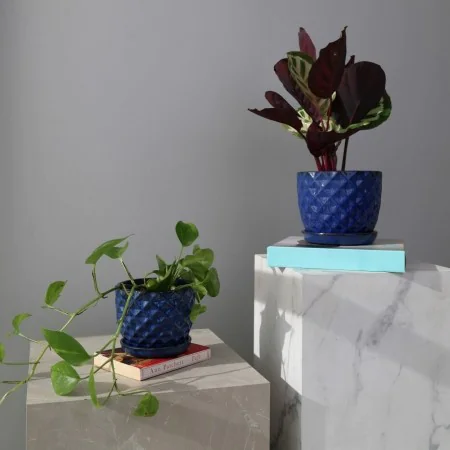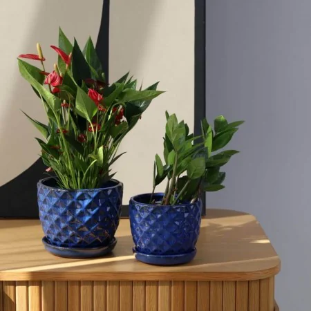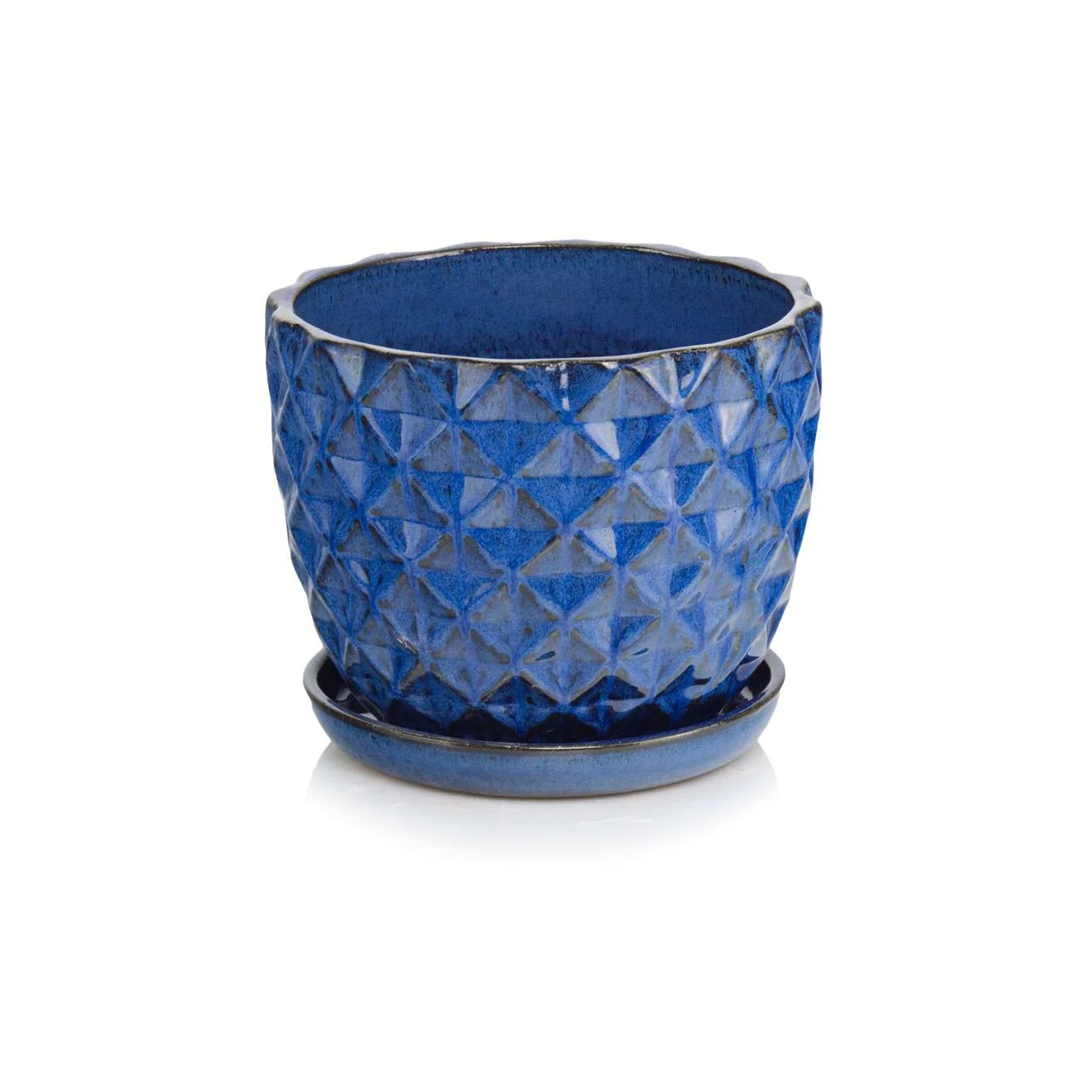 Średnia Niebieska kobaltowa ceramiczna donica o okrągłej podstawie w zestawie z KLEJONYM PODSTAWKIEM.