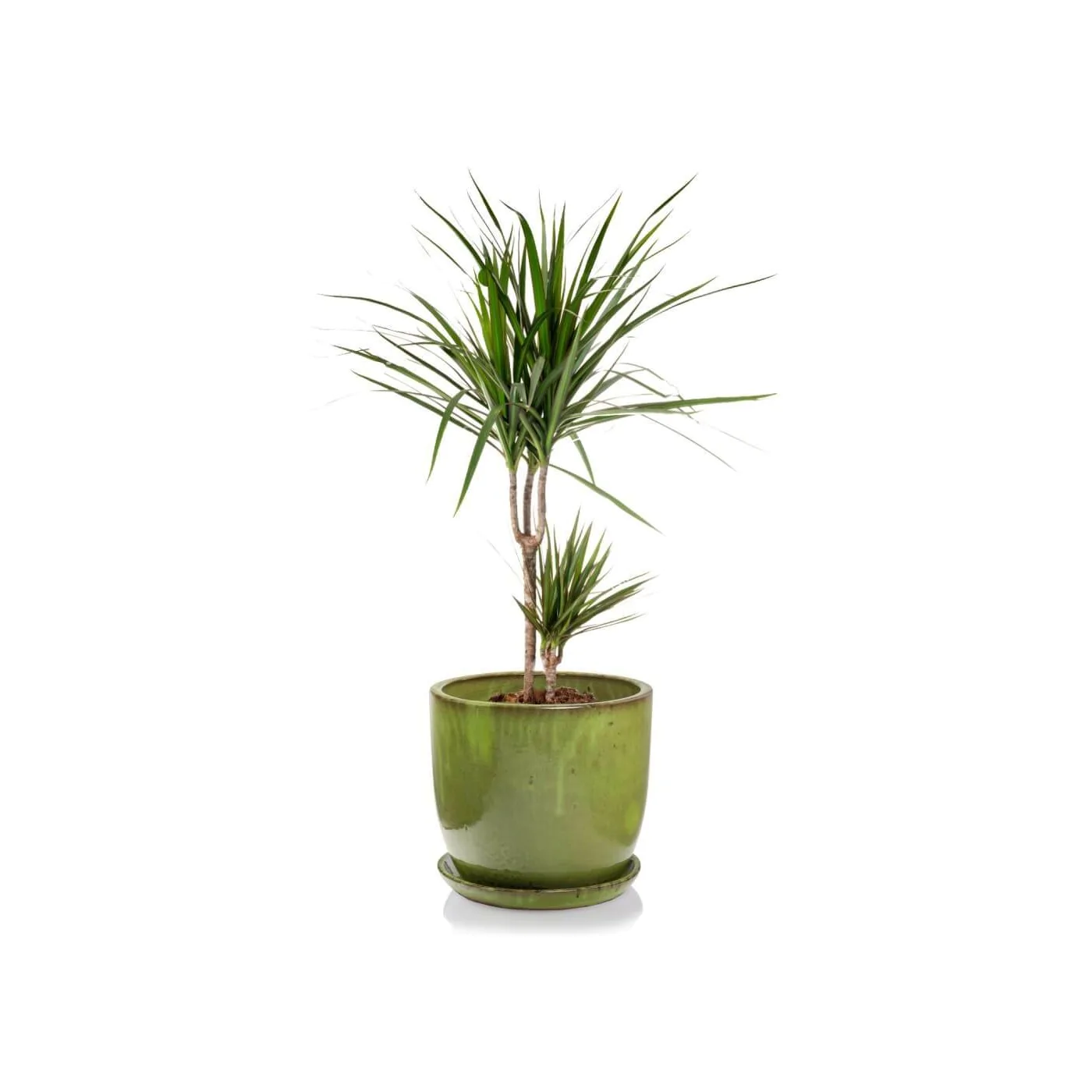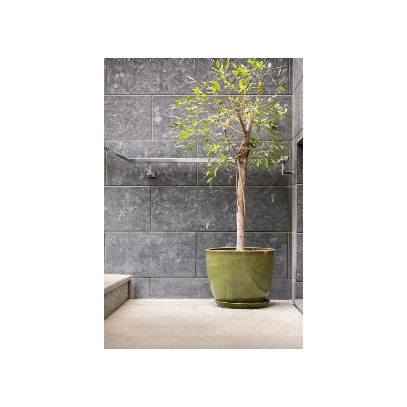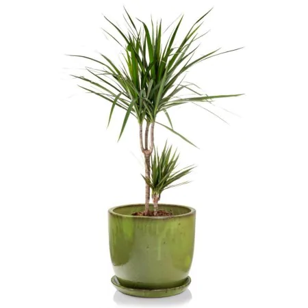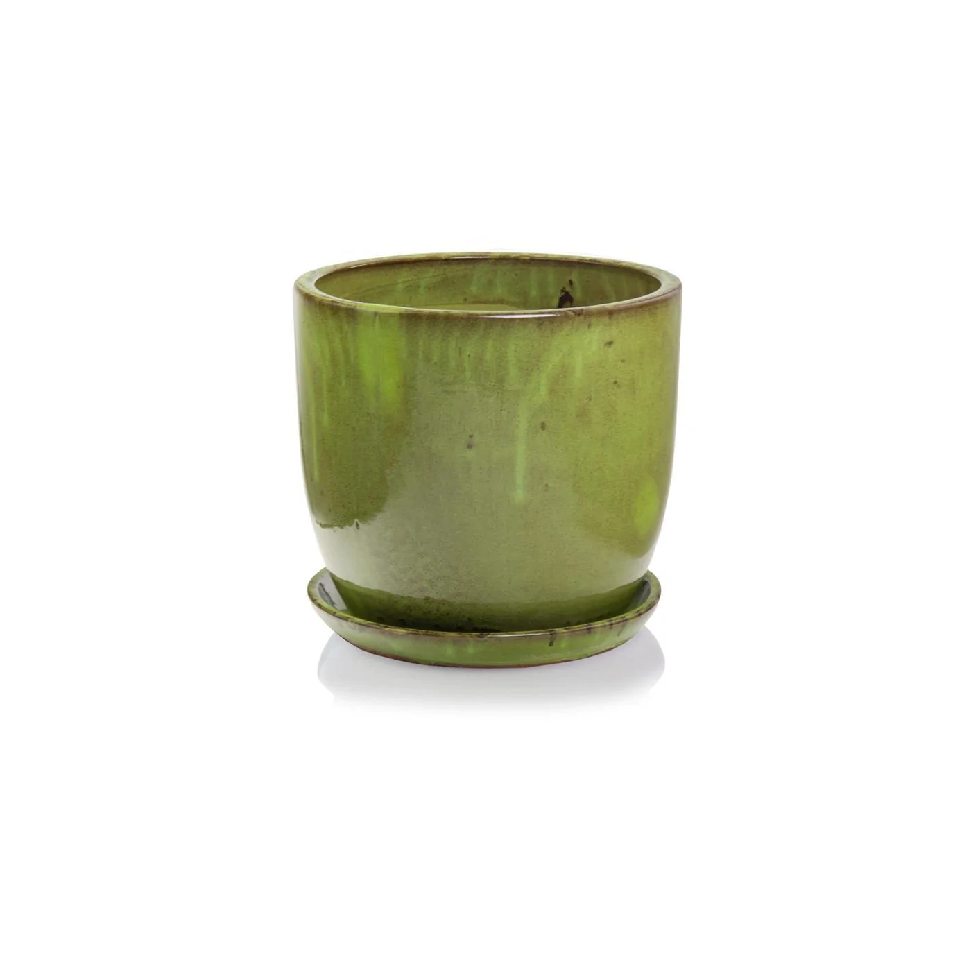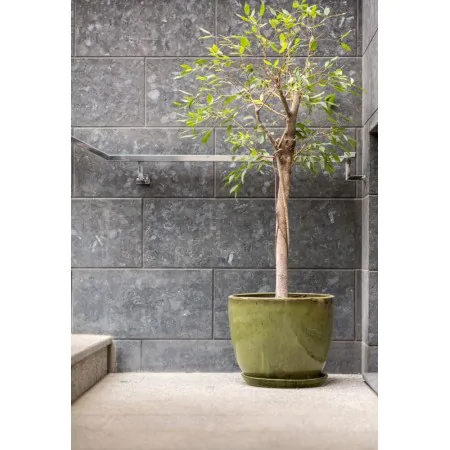 Zielona ciężka ceramiczna donica o okrągłej podstawie w zestawie z podstawkiem.