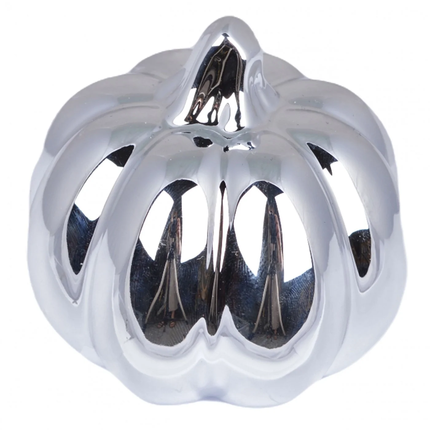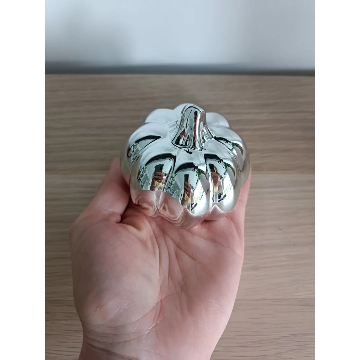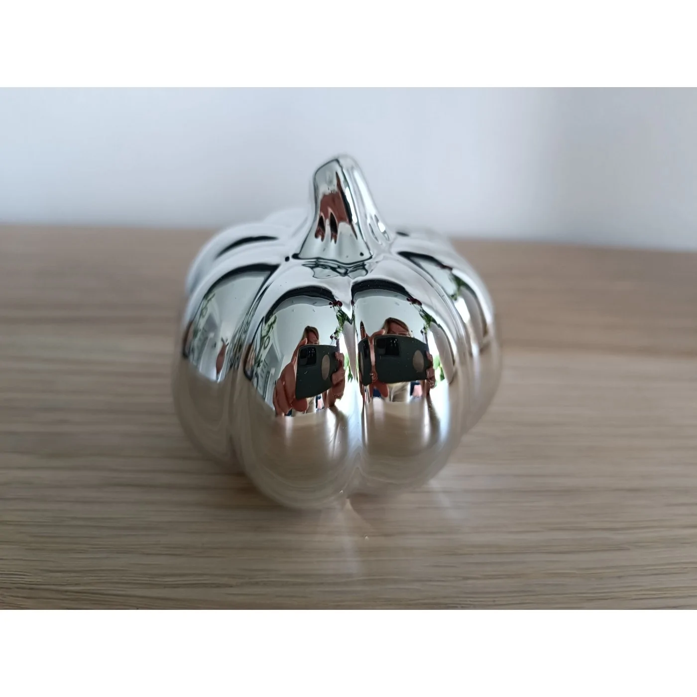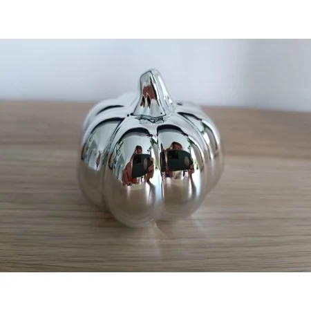 Dynia wykonana z ceramiki w połysku w odcieniu srebrnym . Dynia służy jako dekoracja mała figurka do postawienia.
