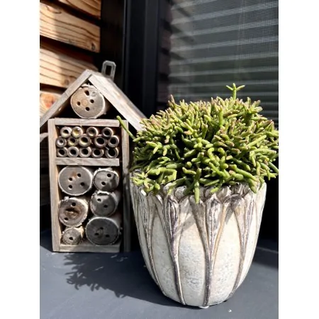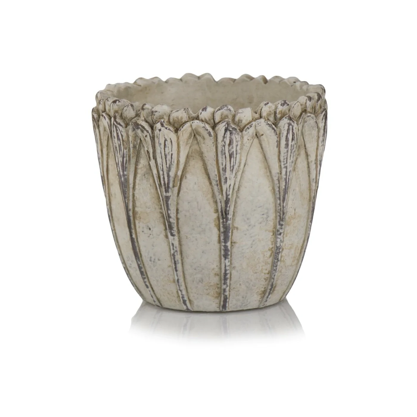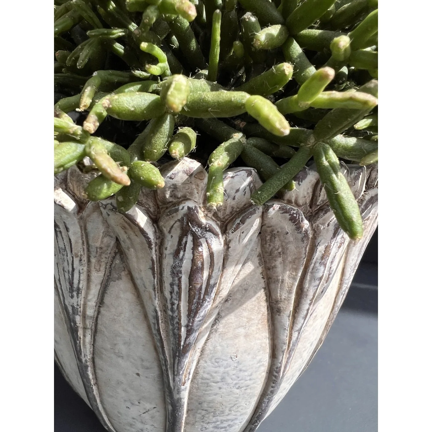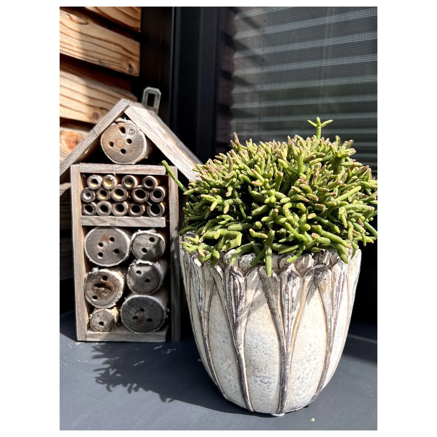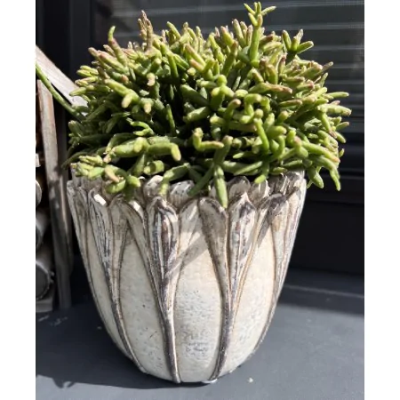 Cała doniczka przypomina misterną rzeźbę, w której każdy element jest wyrazisty i starannie dopracowany.