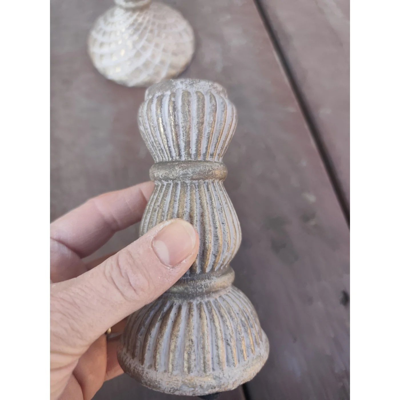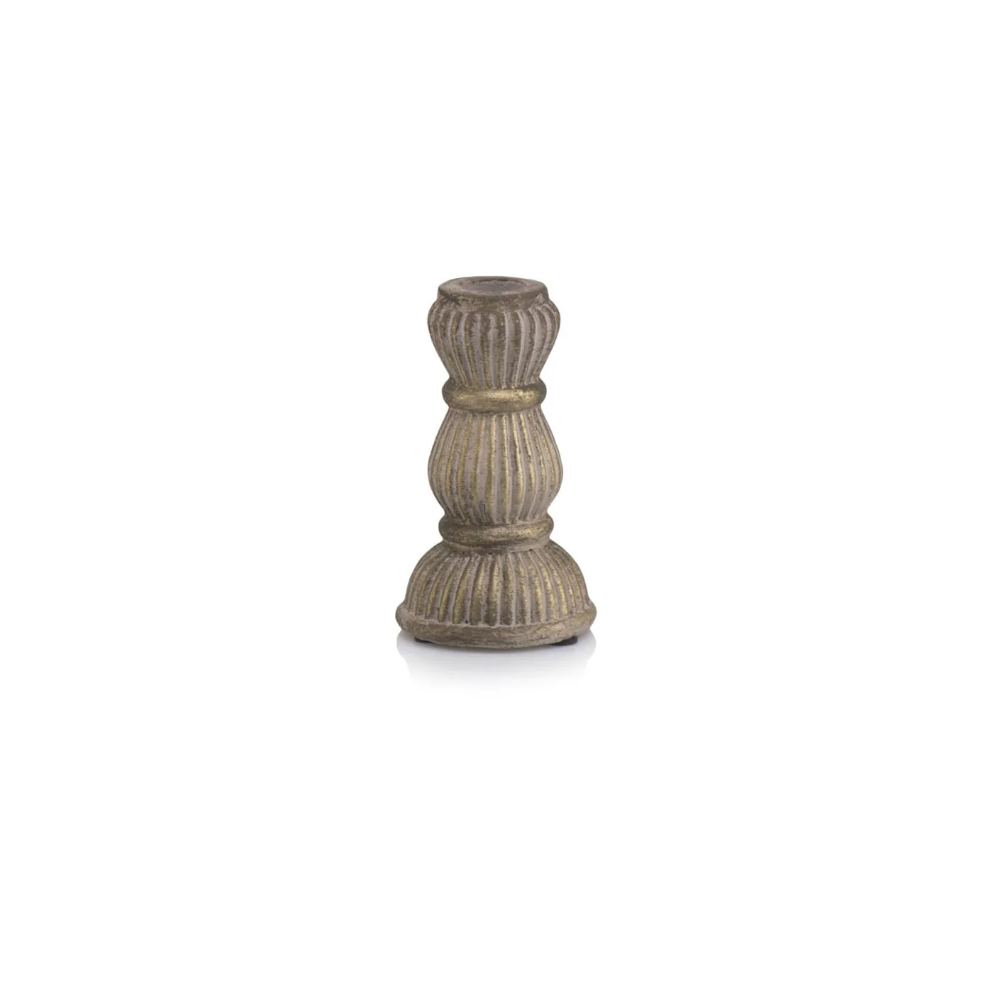 Świecznik wykonany z ceramiki w kolorze brązu jasnego przecieranego ze starym złotem.