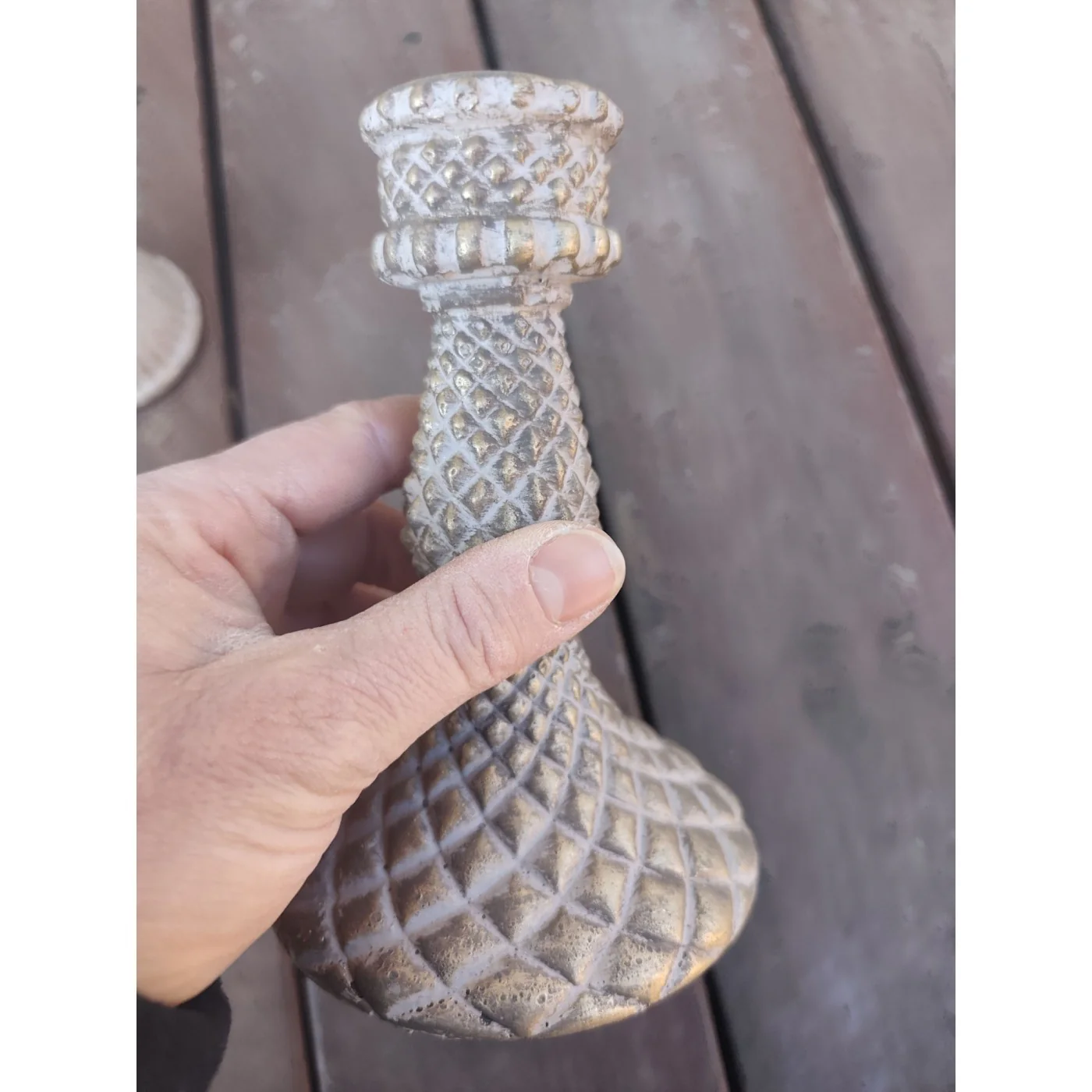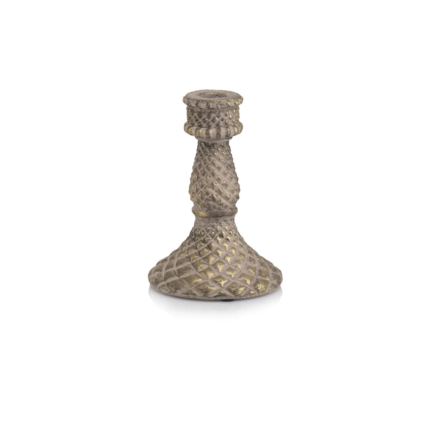 Świecznik wykonany z ceramiki w kolorze brązu jasnego przecieranego ze starym złotem.